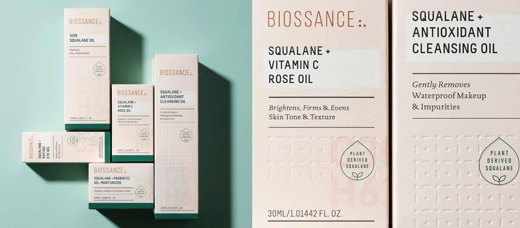Biossance is a biotech-backed skincare company that used sugarcane to recreate the body’s natural moisture molecule. Sugarcane is particularly sustainable because it doesn’t require irrigation or harvesting. Inspired by the eco-friendly nature of sugarcane in their formulas, we used sugarcane paper stock for the brand’s outer boxes. The tree-free stock is printed with vegetable inks. It can be safely composted. And it’s pretty.