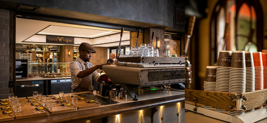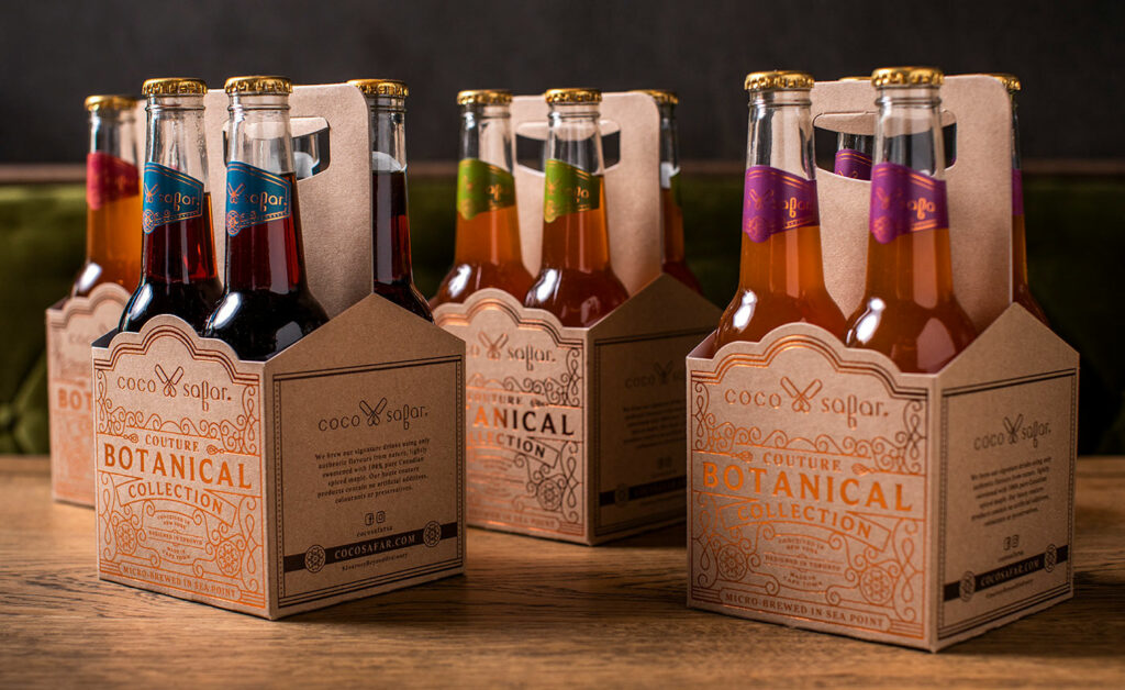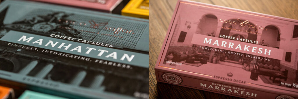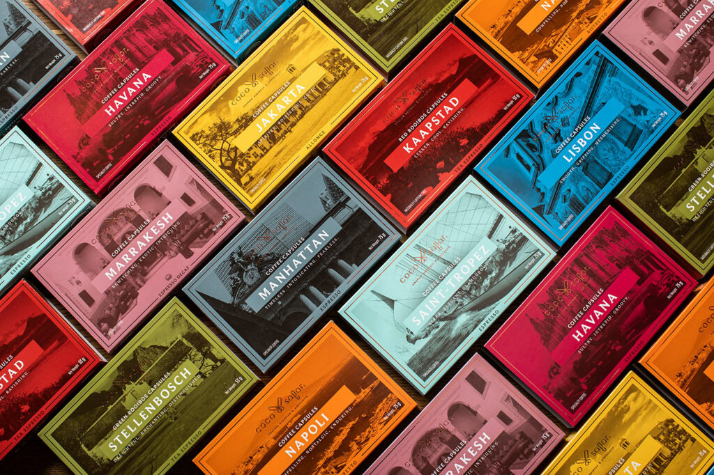 Coco Safar is a luxury coffee, patisserie and café brand. The company is the first to offer auction-lot coffees (the best of the beans), as well as rooibos teas, in capsules. Their City Roast range is associated with nine world destinations, and is presented as a bright, colourful travelogue. The Couture Edition (essentially single estate coffees) is slightly more elegant, with cigar and chocolate cues. The overall feel translates well into cold beverages, too, including botanical brews and tonics. A taste of the sublime.
